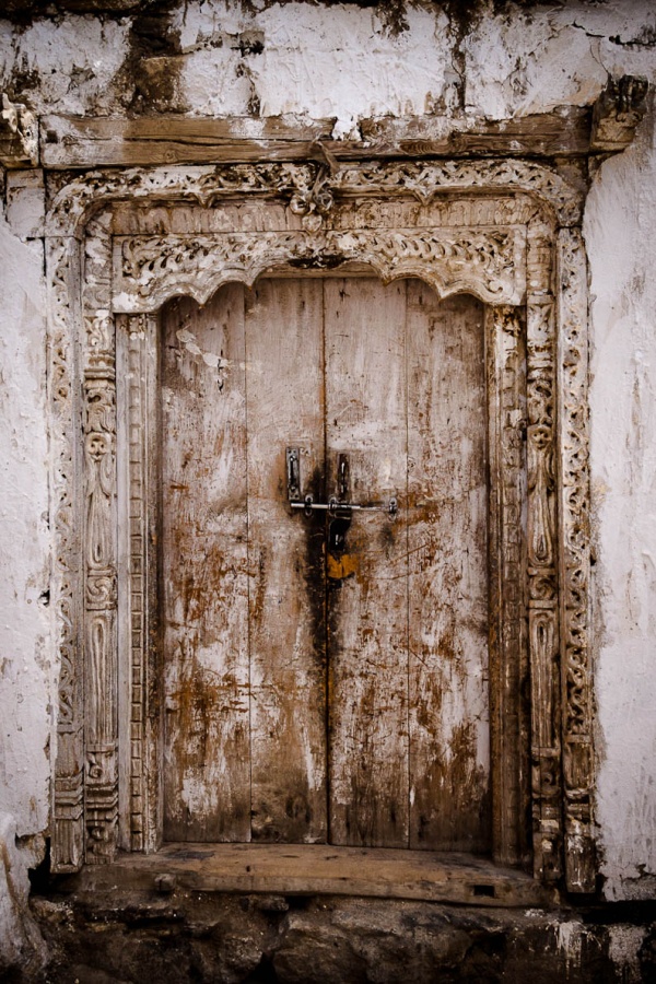 Upon the crumbling door,