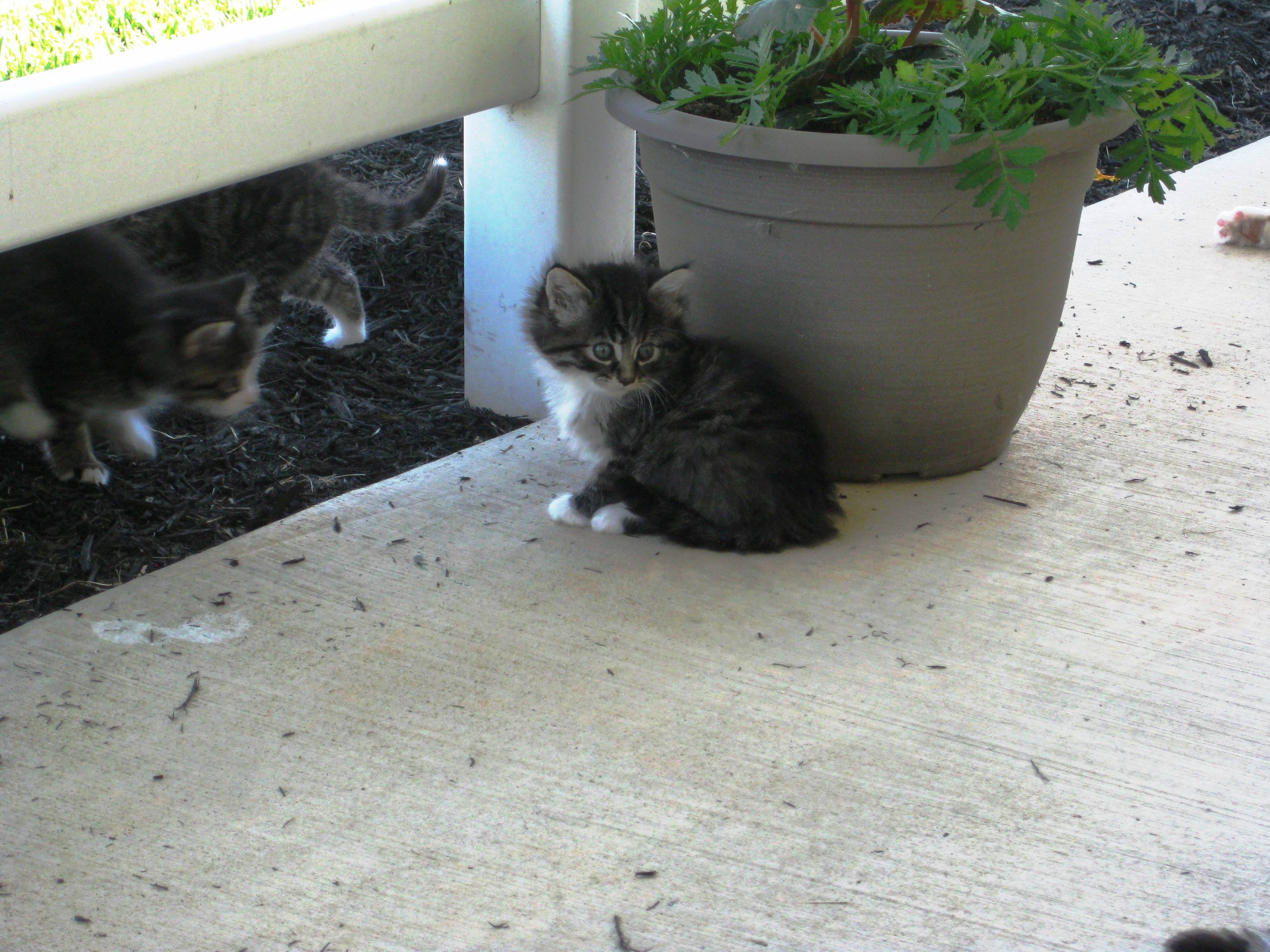 Is that the Gray one????? Yes, he was first to be adopted and then the young lady came back and took his fuzzy brother ( the furry one sitting by the flower pot) to be his friend 🙂 Im so happy they are together.