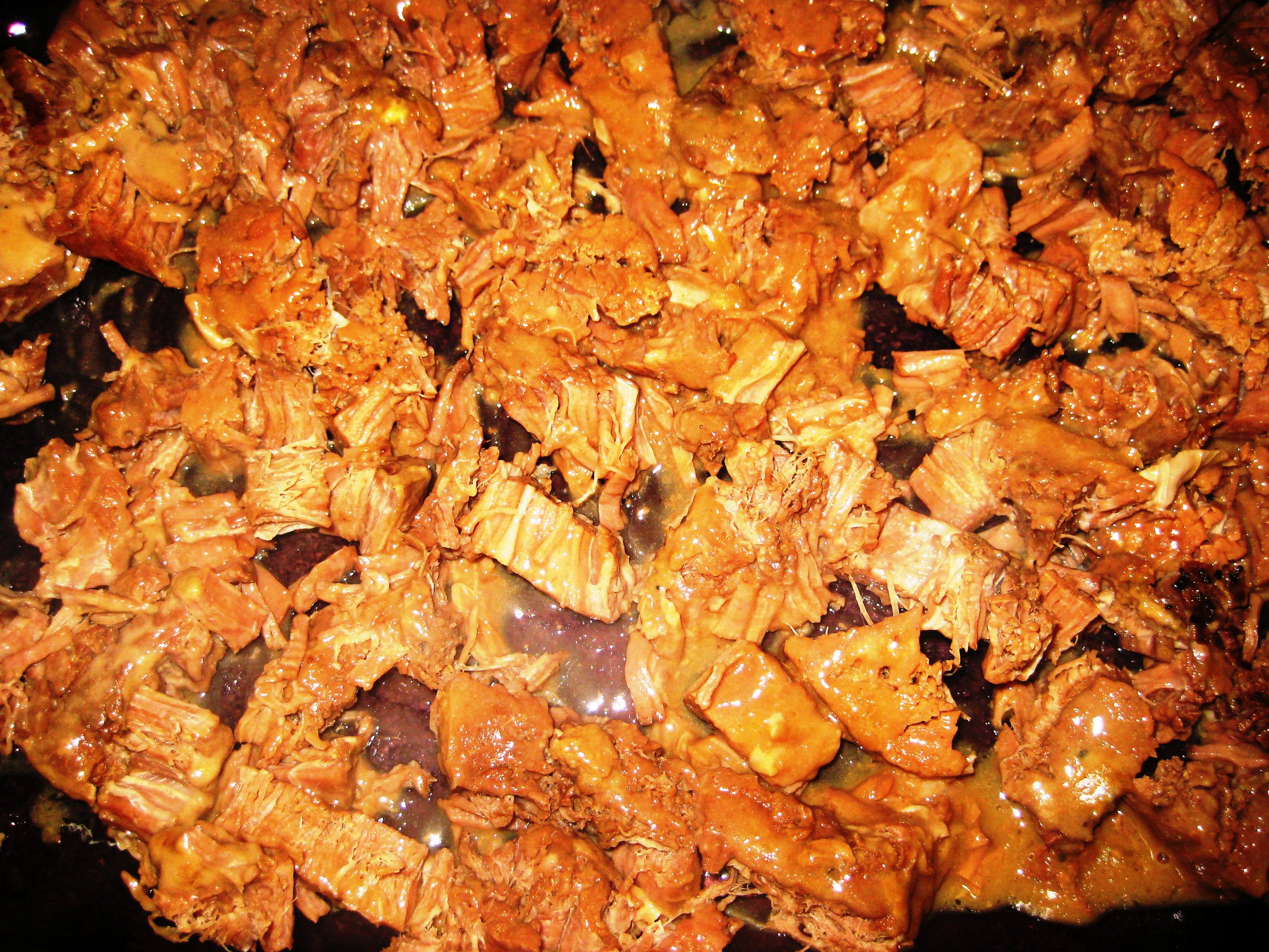 After 6 hours of cooking in slow cooker, remove beef with a slotted spoon and place into the bottom of a 13 X 9 baking dish prepared with olive oil.