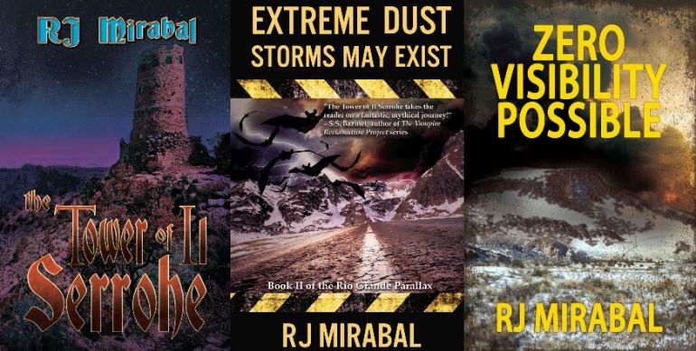 Today I have the privilege of sharing fellow author R J Mirabal, who lived in the Middle Rio Grande Valley most of his life. Recognized with awards for teaching, RJ taught high school English, speech, and drama. Now retired, he purses writing and music and volunteering. RJ enjoys exploring New Mexico’s wilderness on his four-wheeler, hiking, and hanging out with his wife, Cheryl. The Tower of Il Serrohe (Finalist for 2013 New Mexico/Arizona Book Awards) is Book I of The Rio Grande Parallax series. Extreme Dust Storms May Exist, Book II of the series, was released in 2015 (Finalist for 2016 New Mexico/Arizona Book Awards) while Zero Visibility Possible, Book III, released 2016, concludes the series.
